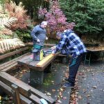 Umrandung und Randplatten im Garten der Arnoldhütte gesetzt und hinter Materialhütte Weg gereinigt